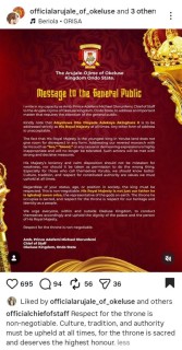 “We urge everyone, within and outside Okeluse Kingdom, to conduct themselves accordingly and uphold the dignity of the palace and the person of His Royal Majesty. Respect for the throne is non-negotiable,” the statement added.
