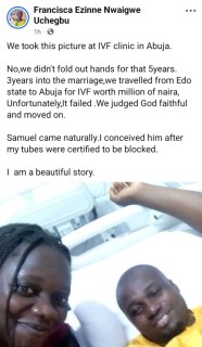 A Nigerian woman, Francisca Ezinne Nwaigwe Uchegbu and her husband have welcomed their first child after five years of marriage.