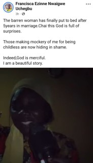 “The barren woman has finally put to bed after 5years in marriage. Chai this God is full of surprises,” she wrote.
