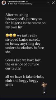 Kunle says Speed’s visit exposed Lagos state. He stated that the visit showed that the only things Lagos can offer are ‘’fake drinks, clubs and beggy beggy skills”.