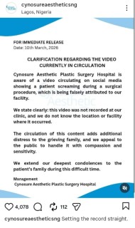 In a statement shared on its Instagram page @cynosureaestheticsng, the hospital said it was aware of the disturbing video being widely shared on social media but insisted the footage was not recorded at its facility.