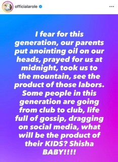 In a post shared on Instagram, Arole said unlike parents of the older generation who were known for anointing their children and praying over them at midnight, parents of this generation just want to go clubbing, gossip and drag people on social medi.