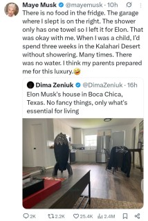 She wrote: “There is no food in the fridge. The garage where I slept is on the right. The shower only has one towel so I left it for Elon. That was okay with me. When I was a child, I’d spend three weeks in the Kalahari Desert without showering. Many times. There was no water. I think my parents prepared me for this luxury.”