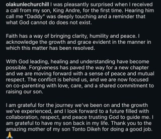 Churchill also expressed gratitude to Tonto Dikeh for her role as King Andre’s mother, praising her for doing a good job and helping to foster peace for their child.