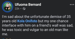The man ,Ufuoma Bernard, on Facebook expressed grief over the passing of Kola Onifoto.