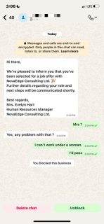 The exchange, which has been circulating on social media, shows a conversation between a job applicant and a representative of NovaEdge Consulting Ltd.