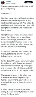 “To my fans, the ones who stream the music, defend me, pray for me, and believe in me, I am sorry.