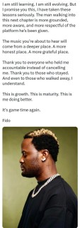 “To the global Afrobeats community, the legends and godfathers who opened these doors before me, my colleagues and everyone who felt disappointed by my words or actions, I apologise. Truly.