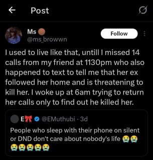 “I used to live like that, untill I missed 14 calls from my friend at 1130pm who also happened to text to tell me that her ex followed her home and is threatening to kill her. I woke up at 6am trying to return her calls only to find out he killed her”,She tweeted.