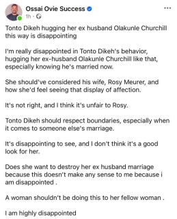 In a post shared on his Facebook page, Ossai said Tonto shouldn’t have hugged her ex-husband knowing that he is a married man. He opined that she should have considered his wife, Rosy Meurer.