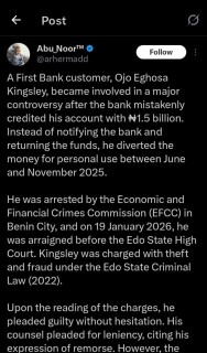According to @arhermadd, the man identifed as Ogo Ehosa Kingsley diverted the money that was mistakenly credited to his First Bank account for personal use between June and November 2025.