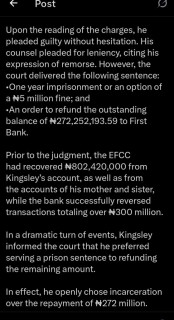 Prior to the judgment, the EFCC had recovered ₦802,420,000 from Kingsley’s account, as well as from the accounts of his mother and sister, while the bank successfully reversed transactions totaling over ₦300 million.