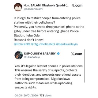‘’Yes, it’s legal to restrict phones in police stations. This ensures the safety of suspects, protects their identities, and prevents operational assets from being compromised. Nigerian laws authorize such measures while upholding suspects rights.”