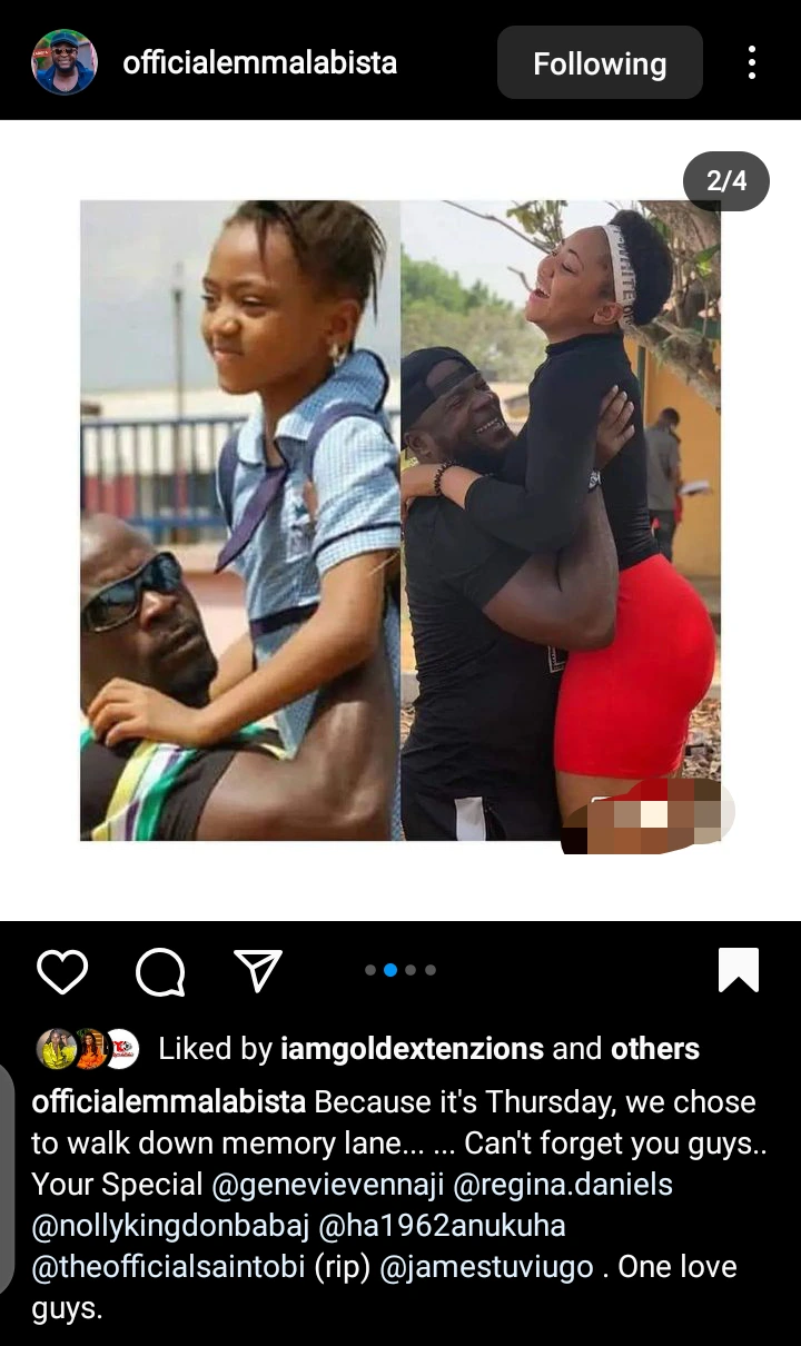 Popular veteran actor and filmmaker, Emmanuel Ehumadu aka Labista has taken to his official social media handle to share adorable throwback photos with Genevieve Nnaji, Regina Daniels, late Saint Obi, Hans Anuku, and Jerry Amilo.