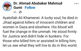 In a post shared on his verified Facebook page, Gumi said Khamenei’s blood “will fuel the change in the ummah.”