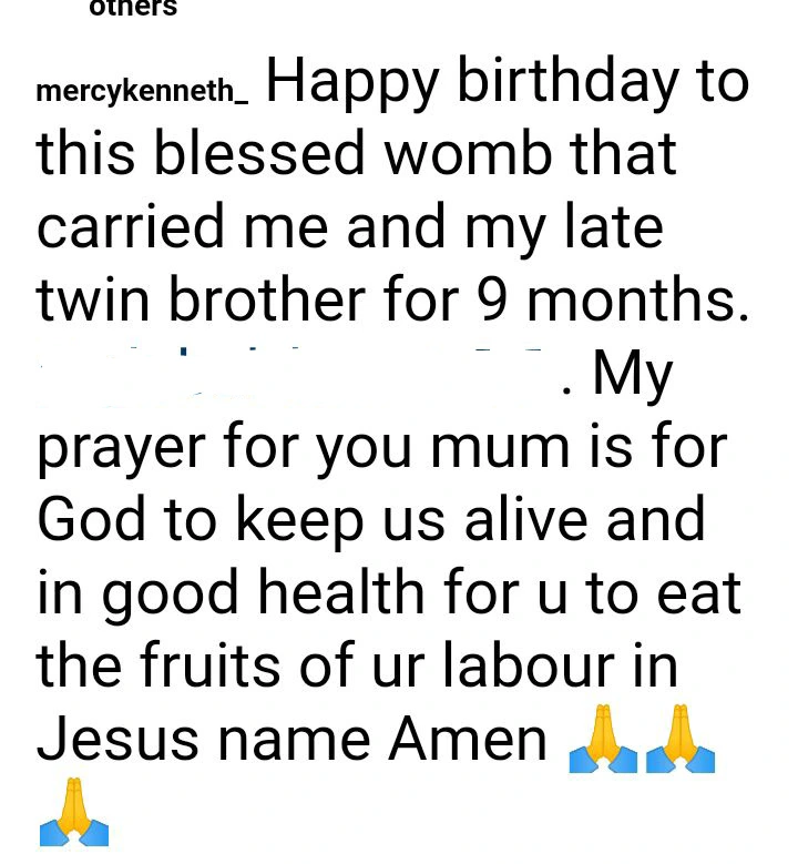 Children can do great things when they enjoy the benevolence of their mothers. Mercy isn’t an exception to this, and that’s why she went to announce her birthday. She posted images on Instagram with a caption that reads, “Happy birthday to the blessed womb that carried me and my late twin brother.”