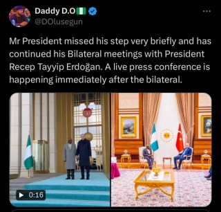 He wrote on his verified X account: “Mr President missed his step very briefly and has continued his Bilateral meetings with President Recep Tayyip Erdoğan. A live press conference is happening immediately after the bilateral.”