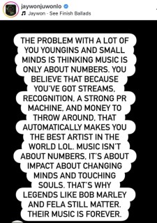 Following the recent debate on the impact afrobeat founder, Fela Anikulapo Kuti’s music has made, singer Jaywon has said that music isn’t about numbers but about the impact the music has on the public.
