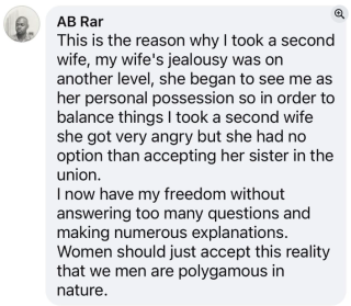 “Finally, men are polygamous by choice, nature has nothing to do with it. Please take care of your wives and begin to make amends immediately. I wish you the best.”