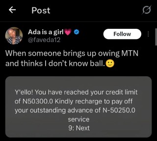 The lady identified with the X handle, @faveda12 posted the message from the network provider urging her to repay her credit loan.