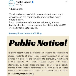 Following the series of allegations, NAPTIP in a statement released on its social media handles this morning February 24, said it takes all reports of child sexu@l abuse/misconduct seriously and are committed to investigating every credible claim as regards the trending claims of sexu@l ass@ults in daycare settings in Nigeria. It mentioned that if anyone has factual information, evidence, or were directly affected, such persons should reach out confidentially via DM or email info@naptip.gov.ng.