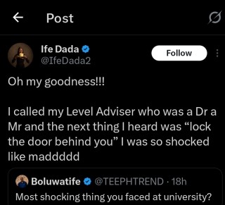 The lady, identified by her X handle @IfeDada, shared that the incident was an extremely shocking encounter during her university days.