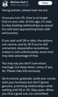 The message, posted on X (formerly Twitter), quickly gained attention for its direct tone and traditional views on love, marriage, and timing.