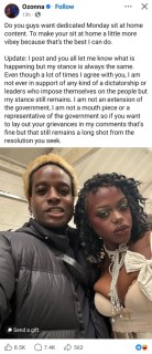 He wrote: “Update: I post and you all let me know what is happening but my stance is always the same. Even though a lot of times I agree with you, I am not ever in support of any kind of a dictatorship or leaders who impose themselves on the people but my stance still remains.