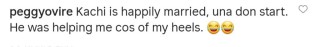 Reacting on a post calling Kachi her lover, Peggy wrote: “Kachi is happily married, una don start. He was helping me cos of my heels.”