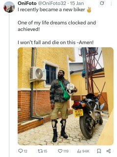 In the caption, he wrote: “I recently became a new biker. One of my life dreams clocked and achieved! I won’t fall and die on this -Amen!”