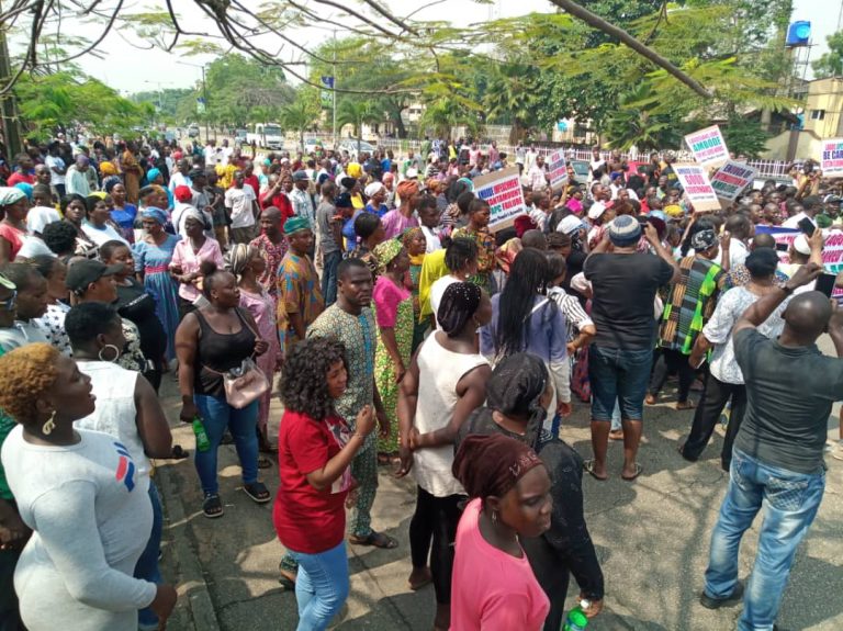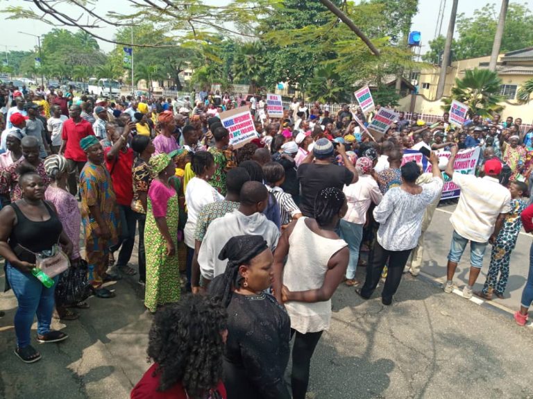 The men and women, who carried banners with inscriptions of their agitations, said the removal of Ambode would disrupt the peaceful conduct of the general elections.