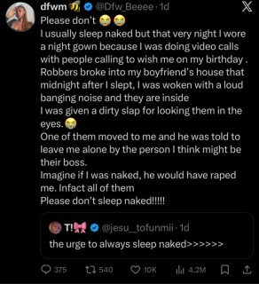 “Please don’t sleep naked” – Lady shares scary robbery experience