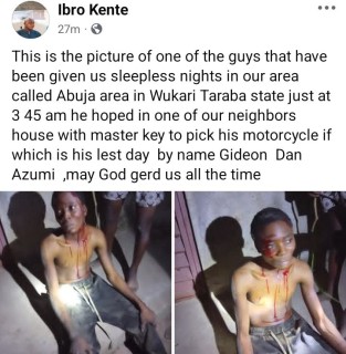 “This is the picture of one of the guys that have been giving us sleepless nights in our area called Abuja area in Wukari Taraba state. Just at 3 45 am, he hoped in one of our neighbor’s house with a master key to pick his motorcycle. By name Gideon Dan Azumi, May God help us all the time,” he wrote.