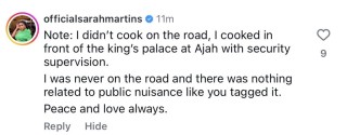 Sarah Martins responds after Lagos Commissioner, Tokunbo Wahab, for Environment called her out for cooking on the road