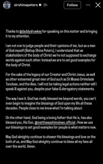 In a statement released on his Instastories today, Shina Peters said he will not join issues with Ashimolowo for making such comparison and degrading statements and will refrain from speaking ill of Ashimolowo or taking any legal action against him because he, Sir Shina Peters, is also a clergyman and knows better.