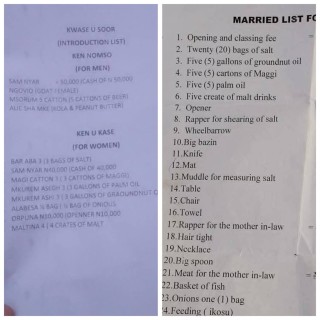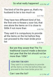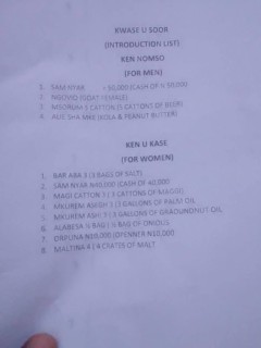 According to her, despite the law passed by the Tor Tiv and the Tiv Traditional Council concerning marriage in Tiv land, her family insisted that her suitor must provide all the items on the list.