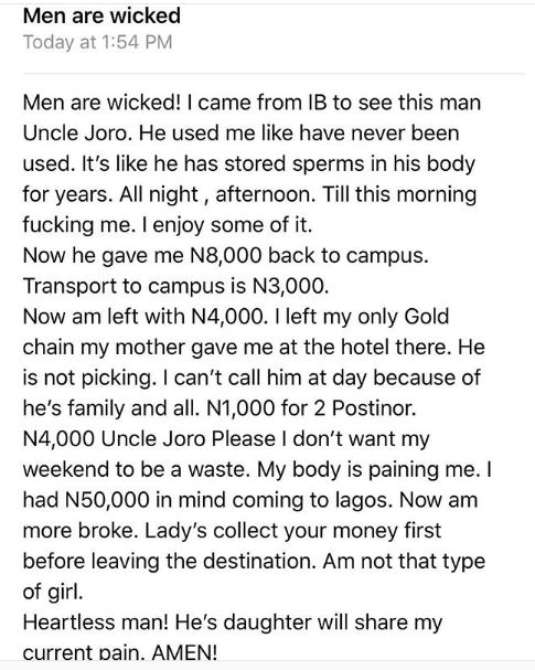 Relationship adviser, online psychologist and love doctor, Joro Olumofin has shared the story of a young school girl who was paid a paltry sum of money after sleeping with a married man in Ibadan, Oyo State.