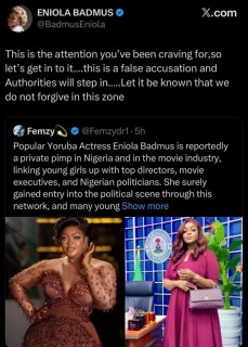 Nollywood actress Eniola Badmus has broken her silence after a social media user accused her of being a private pimp for top politicians and movie executives.