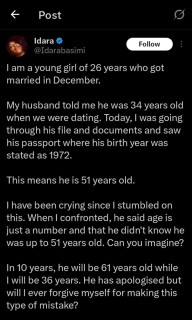 “Why will I ever forget this?”- Lady heartbroken after discovering her husband’s real age, shares what he told her