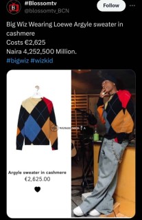 The photos showing Wizkid wearing the Loewe Argyle sweater worth ₦4.2 million have gone viral on social media, with many individuals sharing them on their pages.