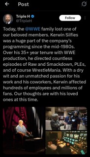 “Today, the @WWE family lost one of our beloved members. Kerwin Silfies was a huge part of the company’s programming since the mid-1980s. Over his 35+ year tenure with WWE production, he directed countless episodes of Raw and Smackdown, PLEs, and of course WrestleMania. With a dry wit and an unmatched passion for his work and his coworkers, Kerwin affected hundreds of employees and millions of fans. Our thoughts are with his loved ones at this time”, His tweet reads.